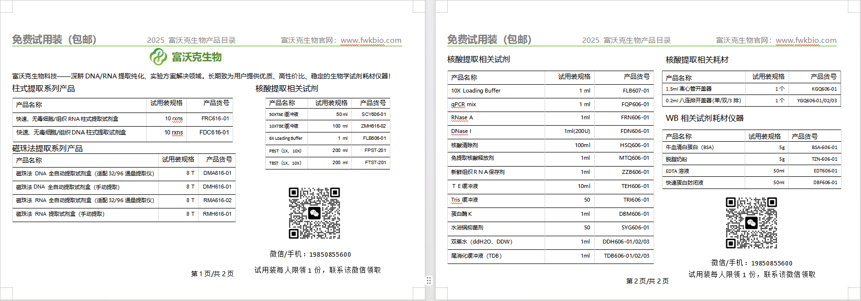 杭州富沃克生物科技有限公司——深耕DNA/RNA提取纯化试剂盒、实验方案解决领域。从技术源头研发,依托自主搭建的核心技术平台,可高效、规模化地进行产品自主开发,是国内少数同时具有自主开发能力的研发创新型企业。 富沃克生物研发团队由分子生物学、免疫学、生物信息学、化学和材料学等多领域复合型研发人员组成,50%以上的研发人员拥有硕士及以上学历。已成功推出柱式法、磁珠法DNA/RNA提取纯化试剂盒,形成了覆盖科研院校、生物企业、制药企业、医院等多种客户群体的客户组合。 富沃克生物长期致力于为用户提供优质、高性价比、稳定可靠的生物学试剂、仪器产品和专业技术支持!助力加速生命科学研究!