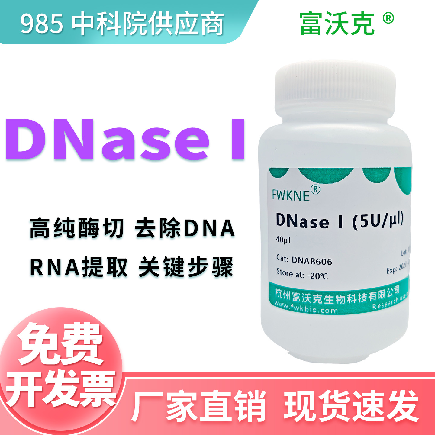DNase I是一种可以特异性切割单链或双链DNA的核酸内切酶。它主要用于RNA提取后的纯化步骤,有效去除基因组DNA污染,确保后续RT-PCR、转录组测序等结果的准确性。此外,DNase I也用于制备无DNA的蛋白样品,或在某些克隆实验中切割特定DNA模板。其活性依赖于镁/钙离子,可通过加热或EDTA彻底灭活。