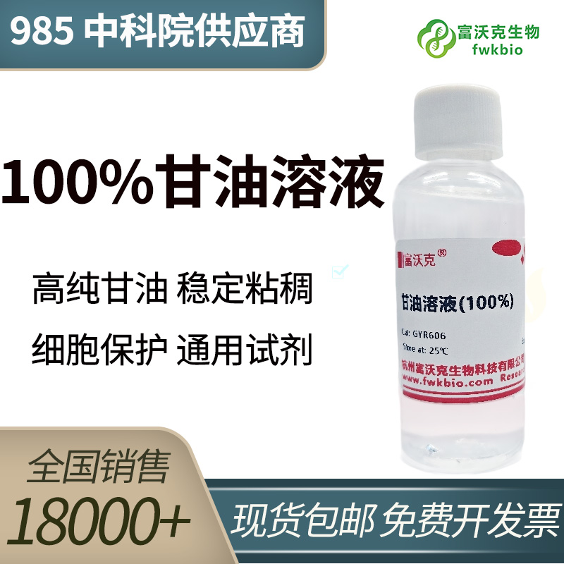 100%甘油(丙三醇)是一种高粘度、强吸湿性的多元醇试剂。在生物学实验中,它常用作细胞的低温冷冻保护剂,用于细菌、真菌或哺乳动物细胞株的长期冻存。此外,甘油也是酶和蛋白的稳定剂、某些高分子量DNA电泳的上样缓冲液成分,并能作为温和的增稠与保湿剂应用于多种反应体系,是实验室的通用型基础试剂。