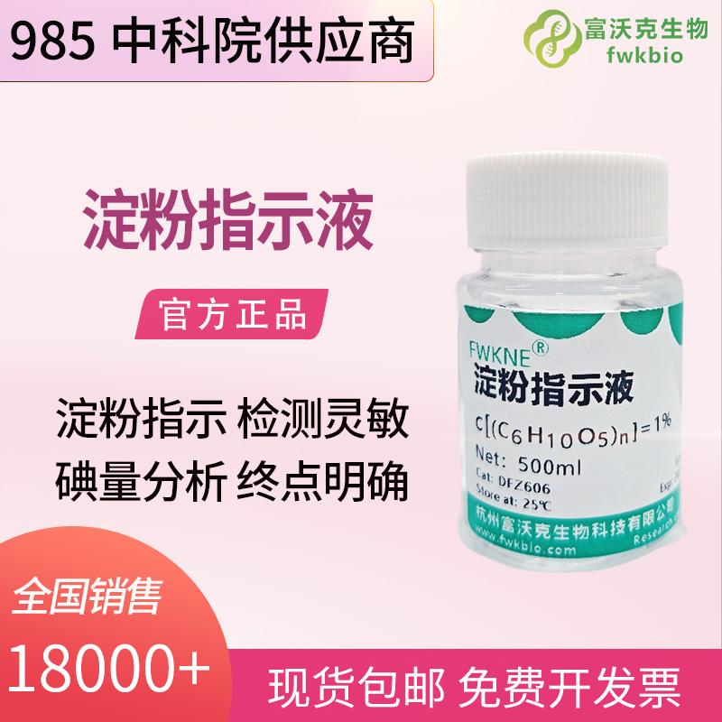 淀粉指示液 可溶性淀粉指示剂 碘量法专用 CAS:9005-84-9 淀粉标准溶液,别名淀粉指示剂、碘量法指示液。采用高纯可溶性淀粉为原料,以超纯水在洁净环境精准配制,遇碘显蓝色,显色灵敏、终点清晰。适用于碘量滴定分析(直接碘量法、间接碘量法)、水中余氯检测、漂白剂有效成分分析、水质硫化物测定及实验室常规滴定。以超纯水为基质,开瓶即用,避免自制指示剂显色不稳定问题。需冷藏避光保存,现货供应,欢迎质检机构、制药企业及实验室老师选购。